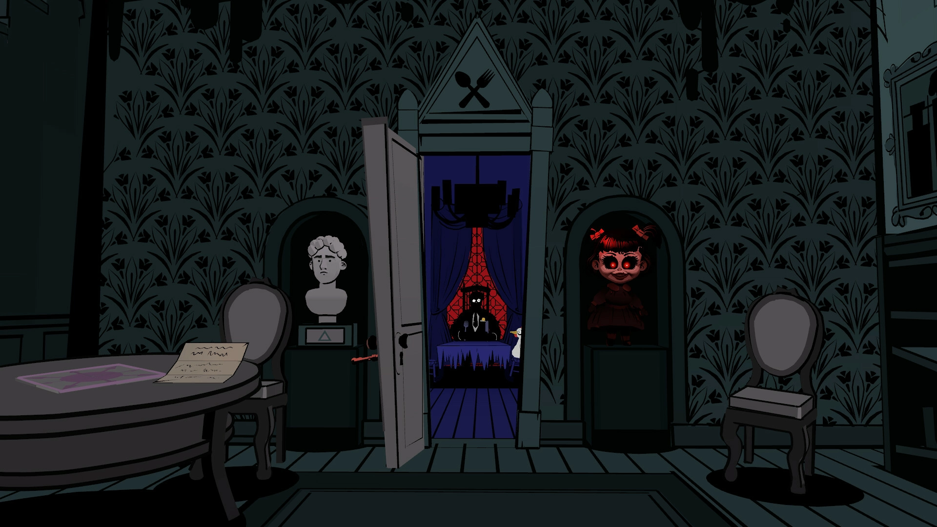 Вы пробираетесь по залам, где картины спорят между собой, а мебель передвигается от скуки. Демоническая кукла следит за каждым шагом и зовёт играть. Головоломки странны, логика пугает, но именно в этом и есть прелесть. Дом не хочет вас убить — он просто проверяет, насколько вы забавны в страхе.