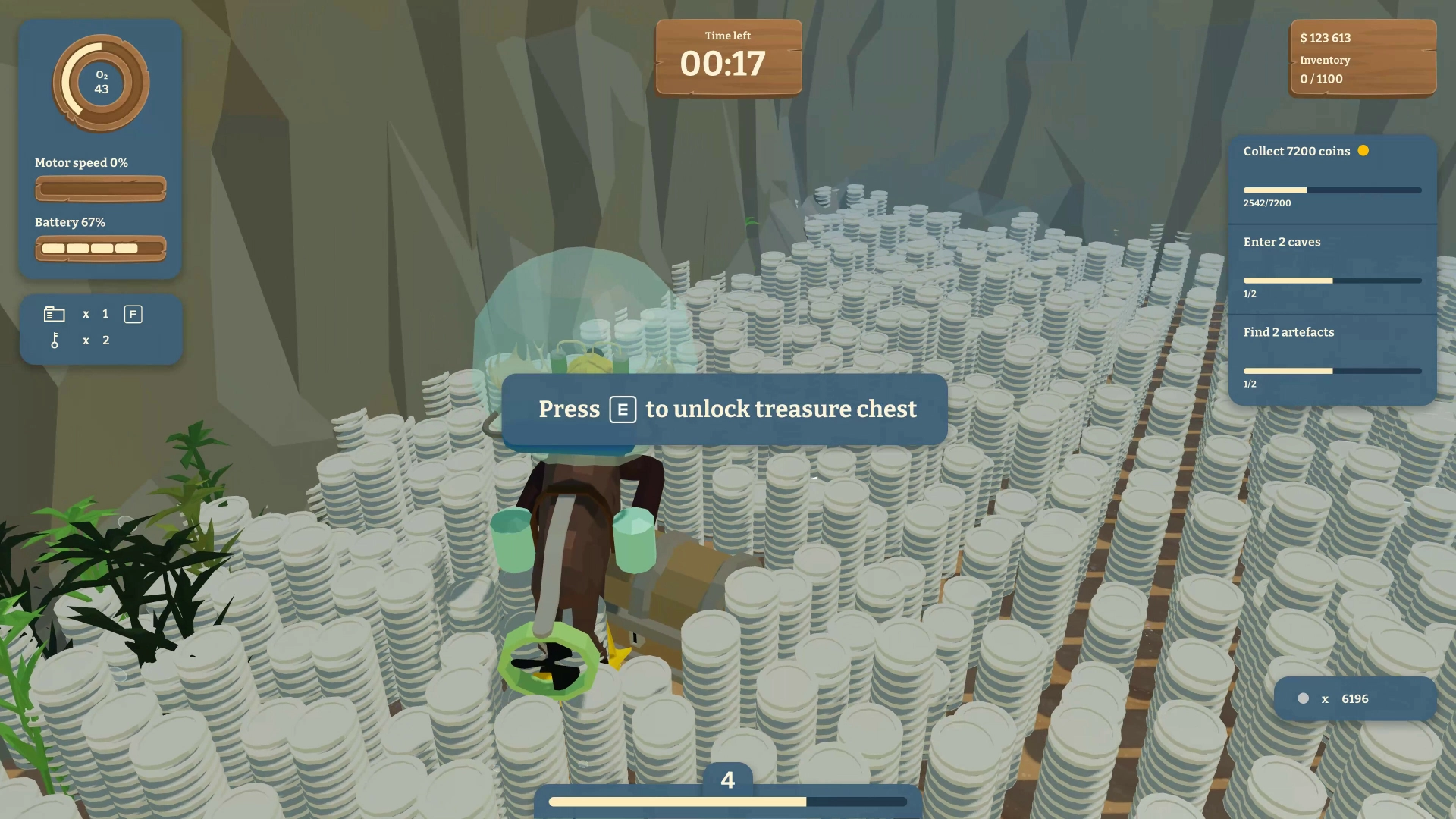 Глубины встречают тишиной и опасной красотой. Чем дальше путь, тем больше давление, и тем ярче сияют монеты среди мрака. Герой использует особый пылесос, собирая блестящие богатства, но каждый вдох отсчитывает последние секунды. Иногда среди золота встречаются камни, странно пульсирующие светом — их происхождение неизвестно, но их ценят больше всего.