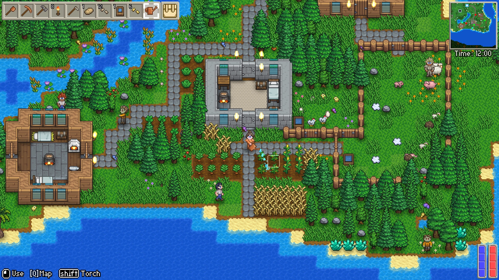 Начав с добычи древесины и камня, вы осваиваете расширенную систему ремесла, создавая инструменты, экипировку и сложные постройки. Поселение развивается через торговлю с NPC и грамотное управление запасами, а продуманная структура рецептов делает усиление персонажа последовательным и логичным.