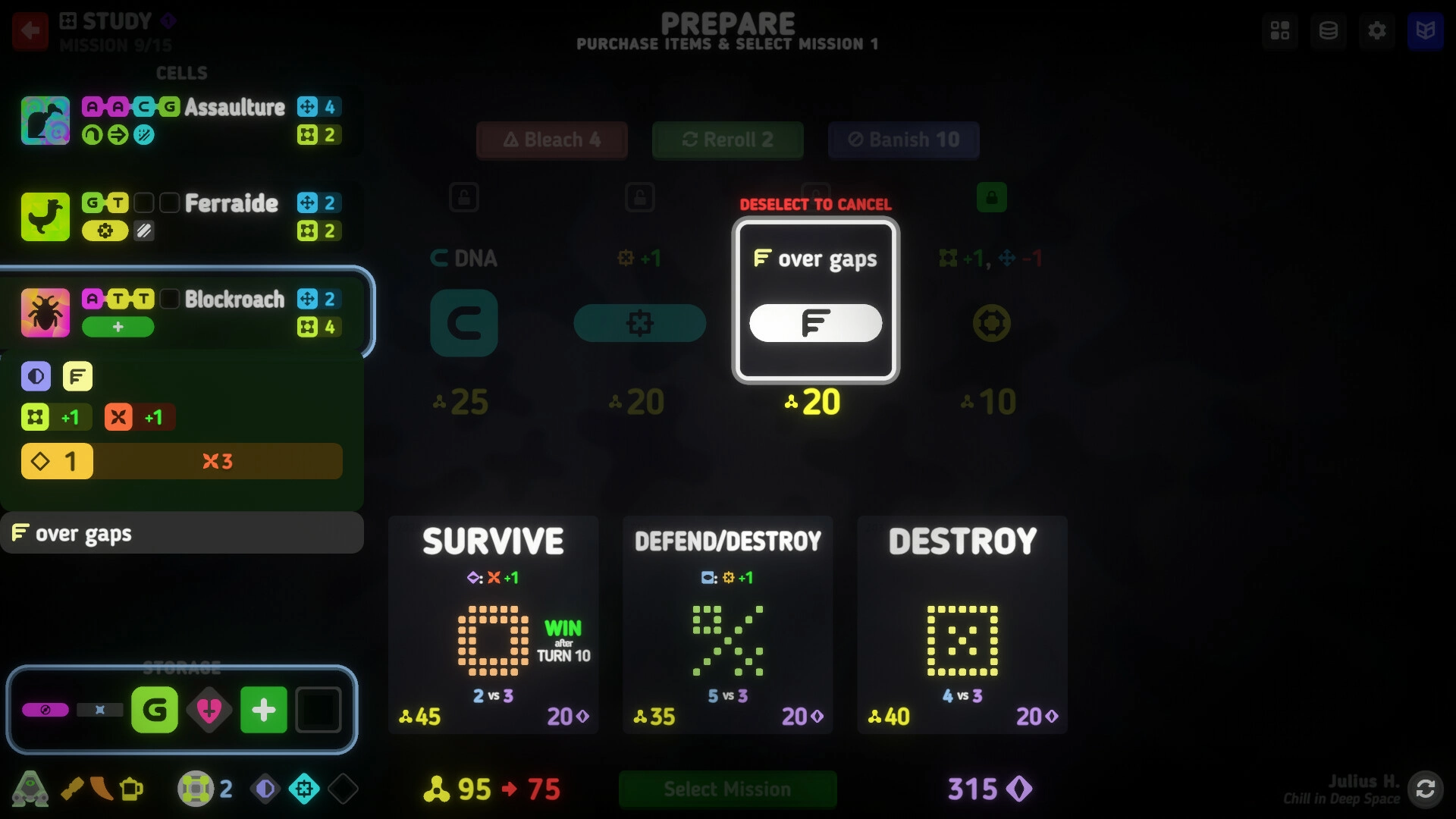 Сражайтесь в органическом аду, где вы проектируете своих бойцов из четырёх букв — A, C, G, T. Создавайте «платформы» из самих себя, ломайте поле, заманивайте врагов в кислоту, оставляйте ловушки в виде собственных хвостов. Всё — ваше оружие.